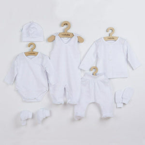 Set pentru bebe, New Baby, I AM, 7 piese, Cu botosei, jacheta maneca lunga, caciulita, body cu maneca lunga, pantalonasi si salopeta cu botosei si manusi, 100% bumbac, Marime 56, 0-3 luni, White