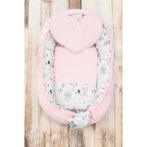Cosulet bebelus, MimiNu, Pentru dormit, Cu doua fete, Baby Nest 105x66 cm, Husa 100% bumbac si catifea moale, Materiale certificate Oeko Tex Standard 100, Cu salteluta, Detasabila, Velvet Sweet Deer Pink