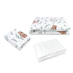 Lenjerie patut 3 piese, Qmini, Pentru patut 120x60 cm, Cu protectie laterala, Din bumbac certificat Oeko Tex Standard 100, Safari