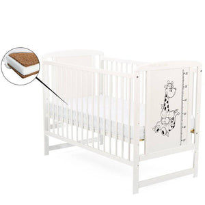 Patut din lemn bebe, 120x60 cm, Din lemn de pin si mdf, Stabil si rezistent, Inaltime saltea reglabila pe 3 nivele, Laterala cu 3 bete detasabile, EN716-1, EN716-2, Alb, Babyneeds, Timmi Girafa + Saltea 10 cm