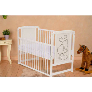 Patut din lemn bebe, 120x60 cm, Cu laterala culisanta, Din lemn de pin si mdf, Stabil si rezistent, Inaltime saltea reglabila pe 3 nivele, Laterala cu 3 bete detasabile, EN716-1, EN716-2, Alb, Qmini, Timmi Heart