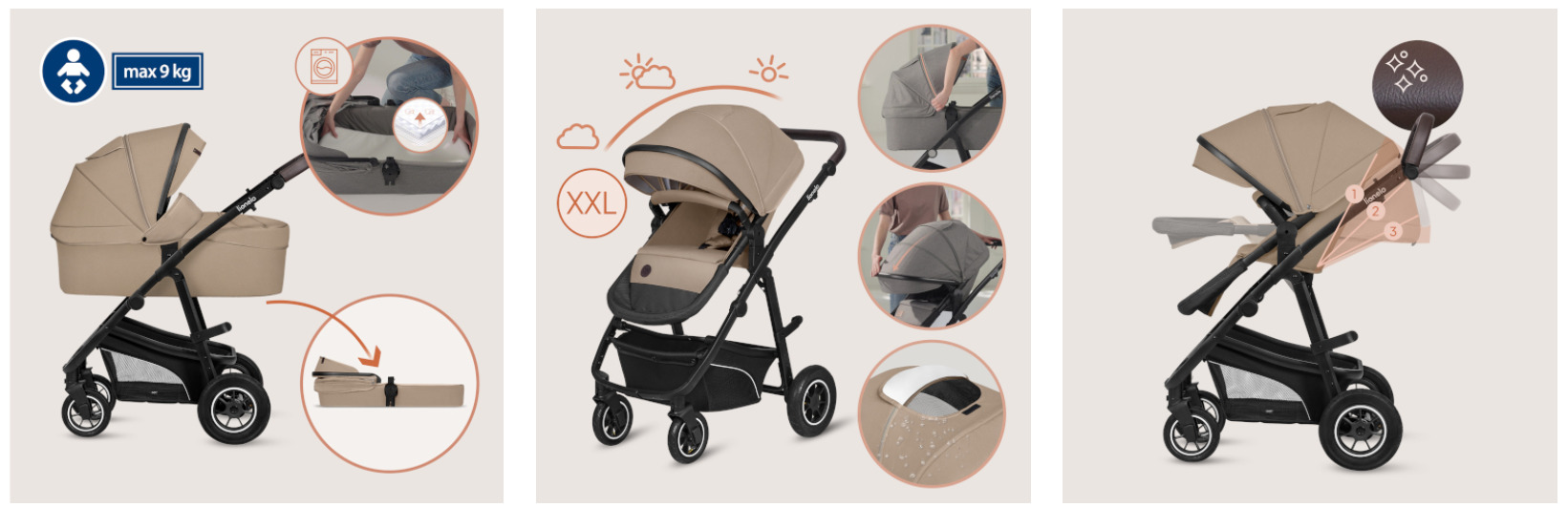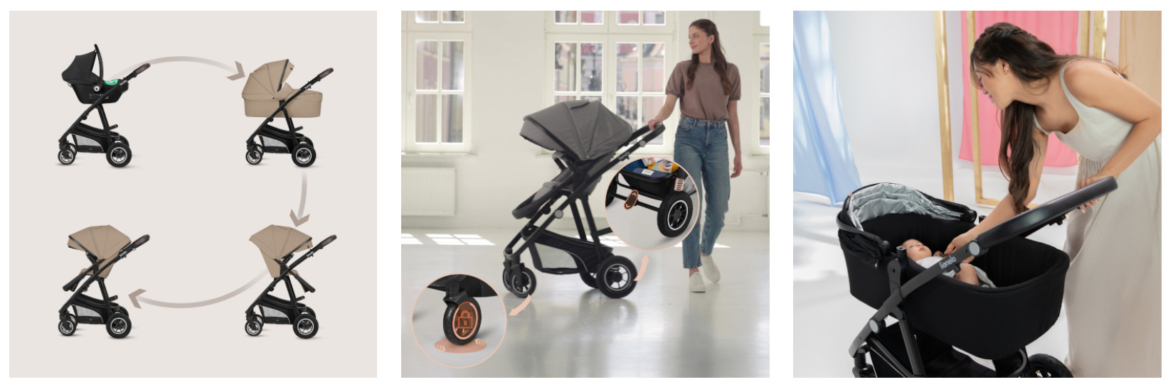 - Confort in timpul calatoriilor: Scaunul auto inclus poate fi transferat cu usurinta de la masina la cadrul caruciorului si invers, facand deplasarile mult mai convenabile.