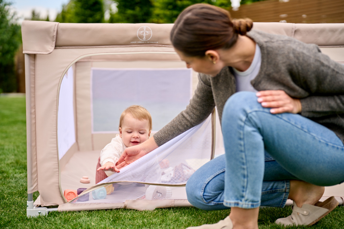 Acest tarc nu este doar pentru locuit acasa, ci si pentru joaca in aer liber . Il poti instala pe terasa, in gradina sau il poti lua cu tine intr-o excursie. Dimensiunile sale compacte si geanta functionala de transport il fac usor de impachetat pentru calatorii.