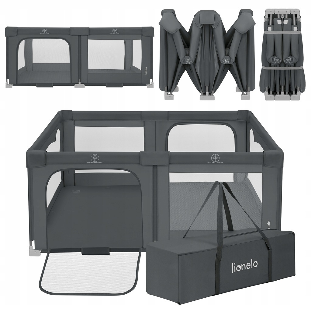 Tarc de joaca copii, Lionelo, Florence Easy Fold, 150 x 180 x 75 cm, Pliere, depliere automata, Include geanta de transport, Din plasa, Cu doua intrari laterale, 0-48 luni, Conform cu EN12227, Gri